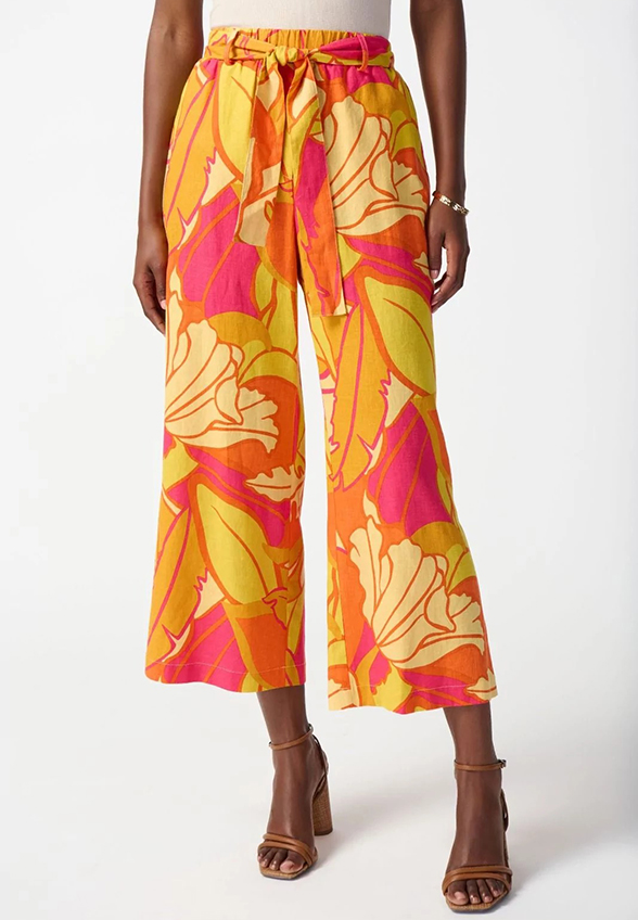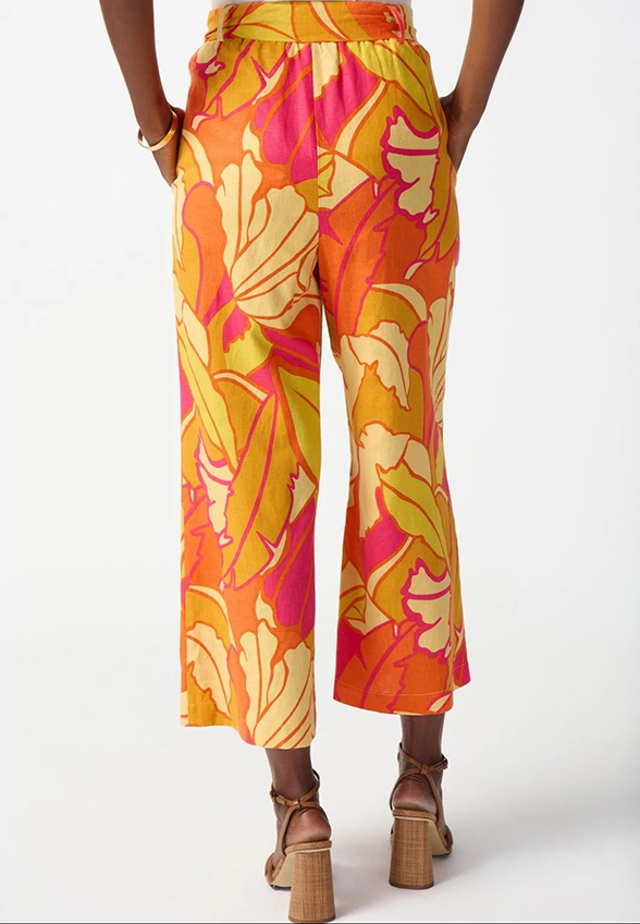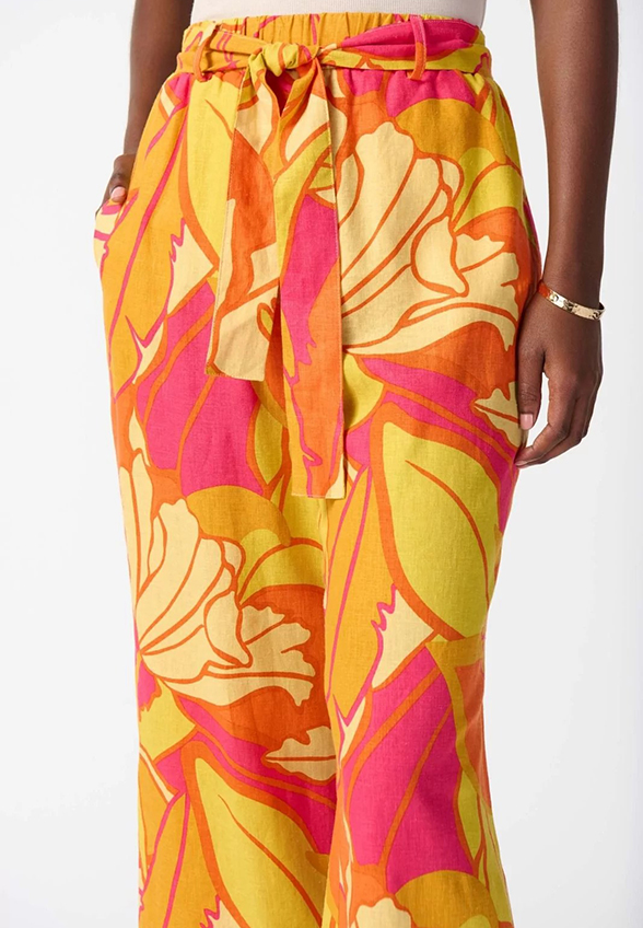 SPODNIE LNIANE Z TROPIKALNYM PRINTEM POMARAŃCZOWE